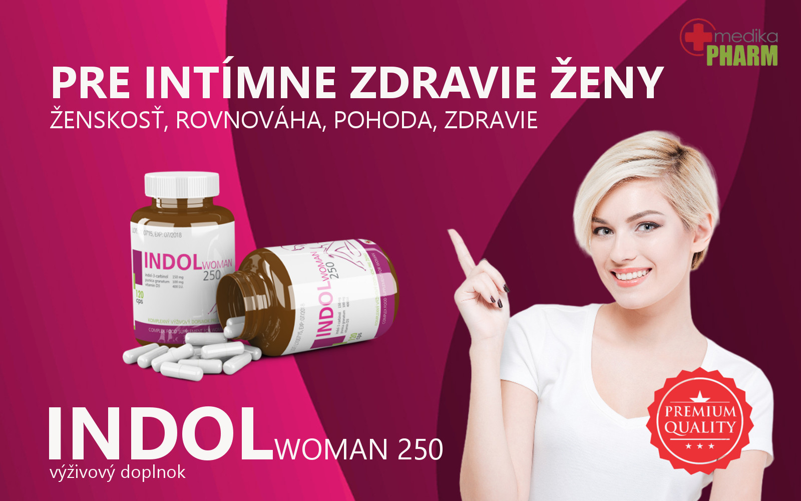 INDOL WOMAN 250 je vyrobený špeciálne pre potreby ženského zdravia. Je zložený z prémiových  surovín, ktorých kvalita je pravidelne, laboratórne kontrolovaná.  Je plnený do kapsúl bez umelých prísad, bez lepku, cukru a konzervačných látok. Je vyrobený v prísnych podmienkach  GMP a IFS Food version 8 (International Featured Standards). Jeho základnou zložkou je indol-3-carbinol, granátové jablko a vitamín D3. Je vhodný tak v prevencii ako aj pri liečbe ženských ochorení vrátane onkologických. Je vhodný na dlhodobé užívanie.